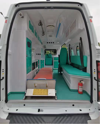 医疗舱配置 | 高分子环保防火耐酸碱材料医用材料的带窗中隔墙、医疗舱尾门及侧门防撞软包保护、中隔板后安装急救医疗柜(带45°倒角),或后视看护座椅、医疗舱左侧安装2*10升氧气瓶(带高精度定压减压阀)、氧气快速终端2个(德标)及高档氧气湿化瓶、蓝色抗菌安全扶手、侧门及尾门安全扶手、2个可折叠输液架、左侧高分子氧气柜、左侧安装医疗设备组合柜,柜侧立面安装透明开口式资料箱、上部高分子医疗吊柜(带45°倒角)、医用地板、自动上车担架与引导平台、右侧长排柜式椅+独立翻折座椅,或独立座椅、铲式担架、免水洗手装置、污物桶、灭火器及支架、 |
